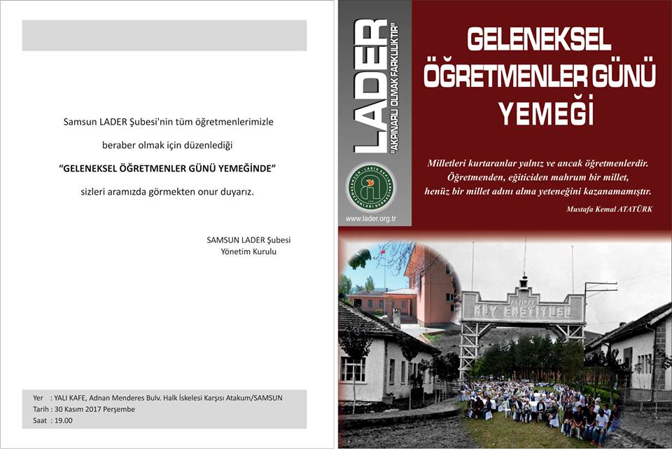 30 Kasım 2017 Perşembe Günü akşamı canlı müzik eşliğinde Geleneksel Öğretmenler Günü Yemeği ile Öğretmenler Günü kutlaması yapıldı. Bu güzel akşamda Lader Samsun Şubesi Başkanı Abdullah Dede ve Kurucu Genel Başkanımız Prof.Dr.Recep Özgültekin birer konuşma yaparak öğretmenliğin kutsallığı ve değerini dile getirdiler. Sunumları ise Yener Şahin yaptı.